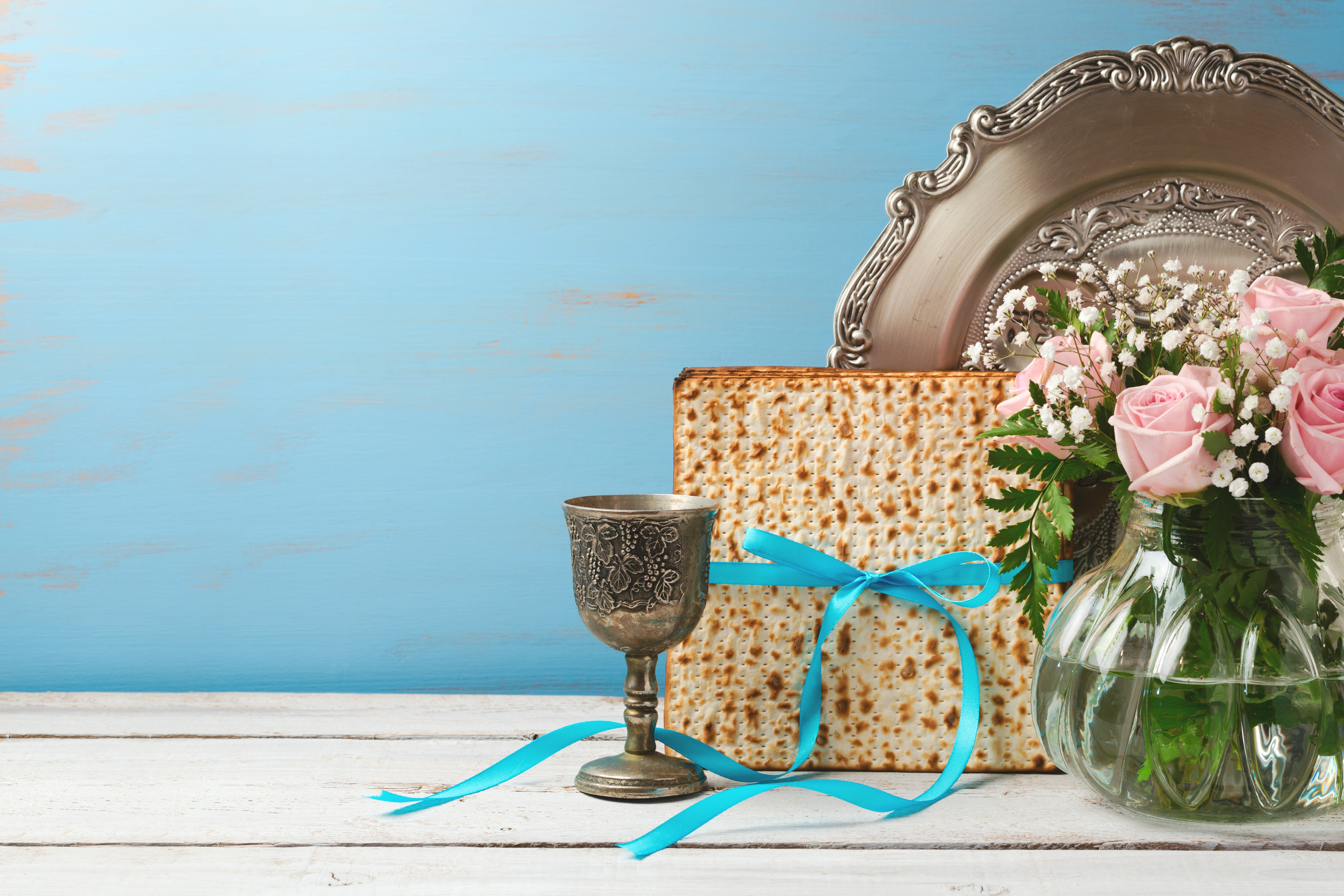 Jewish holiday Passover Pesah background with matzoh, rose flowers and wine glass on wooden table with copy space
